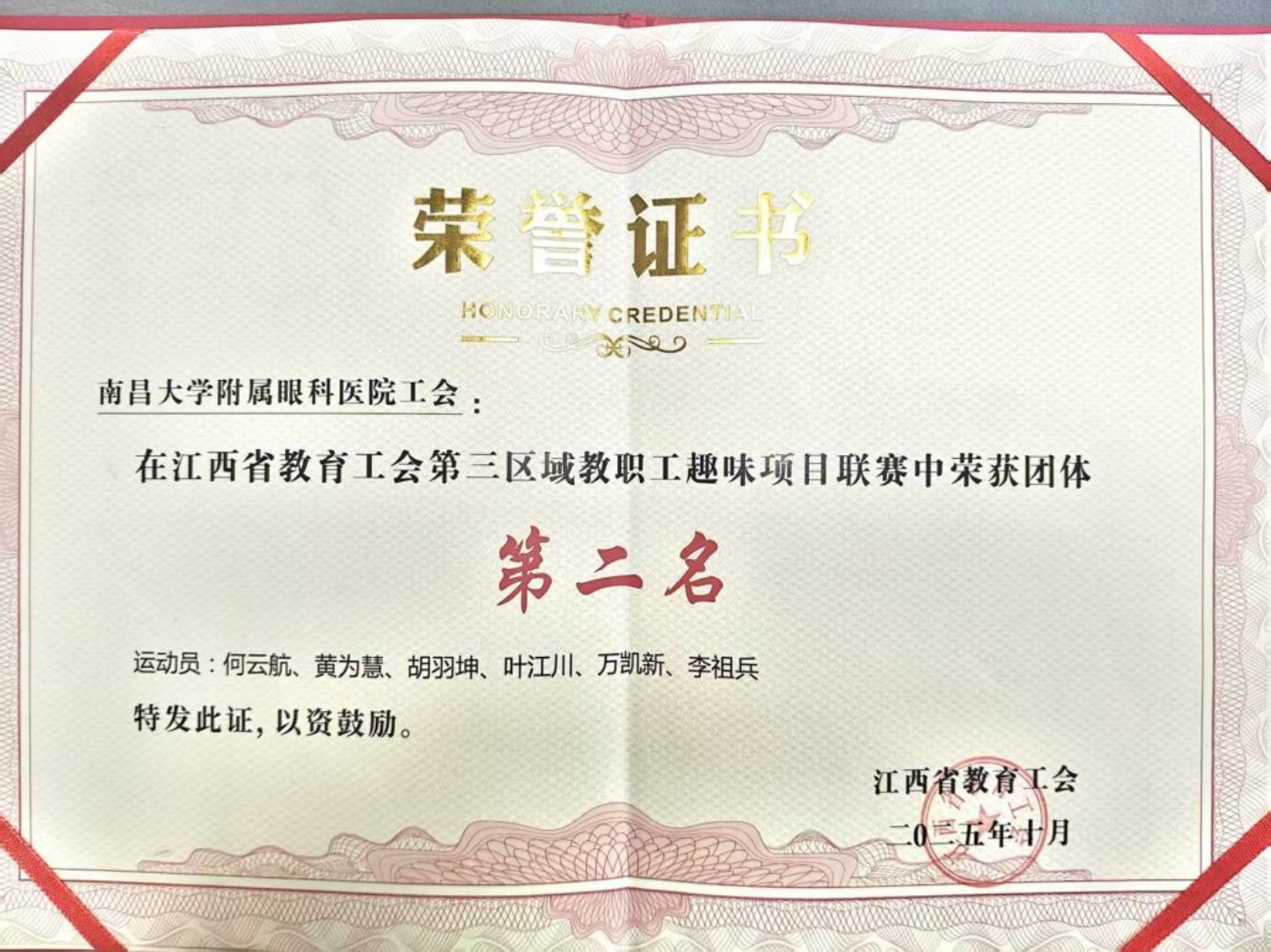 本院讯(胡羽坤报道)近日,在江西省教育工会主办的第三区域教职工趣味项目联赛中,南昌大学附属眼科医院工会代表队团结协作、奋勇争先,最终荣获团体第二名的优异成绩。