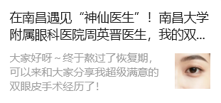 近日,网友一颗橘子通过个人微信公众号,以亲身经历点赞南昌大学附属眼科医院。她在文中详述了由整形美容中心副主任周英晋医生为其施行双眼皮手术的全程体验,对周医生精湛的专业技术以及人文关怀给予高度评价