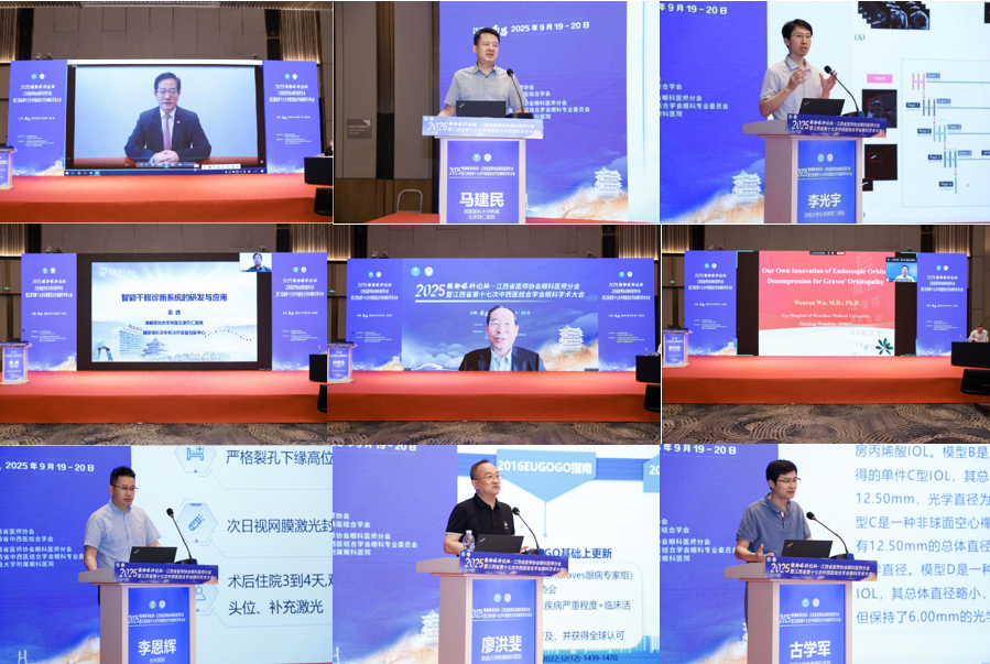 专题报告环节,多位国内知名专家作了专题报告。中国工程院院士、上海交通大学医学院院长范先群教授围绕“视网膜视神经损伤修复”这一主题,系统阐述了其发病机制、研究进展及基因治疗、干细胞技术等前沿方向。首都医科大学附属北京同仁医院马建民教授就“眼肿瘤眼眶病手术并发症的防范”进行经验分享,提出一系列实用临床策略。吉林大学白求恩第二医院李光宇教授介绍了“多模态导航引导下的精准眼眶手术”,通过实际案例展现了该技术在提升手术安全性及精准度方面的显著优势。此外,首都医科大学附属北京同仁医院的袁进教授就“智能干眼诊断系统的研发与应用”作了专题报告,详细介绍了智能干眼诊断系统以及在实际临床应用中的显著效果。山东中医药大学附属眼科医院毕宏生教授就“飞秒辅助技术在复杂白内障手术中的应用”作了精彩报告,详细介绍了飞秒辅助技术在处理复杂白内障病例时的独特优势。温州医科大学副校长、温州医科大学附属眼视光医院吴文灿教授就“眶尖疾病治疗诊疗探索与体会”,分享了团队在个性化治疗方案制定方面的创新思路。台州医院的李恩辉教授针对“如何提高充气性视网膜固定术的成功率”作了深入分析,指出操作要点与常见问题的应对方法。南昌大学附属眼科医院廖洪斐教授对“TED指南/共识”进行专业解读,厘清临床实践中的认识误区。南昌大学附属眼科医院副院长古学军则分享了“基于有限元评估不同襻设计晶状体的旋转稳定性”的研究成果,通过建模分析为晶体设计及手术优化提供理论依据。