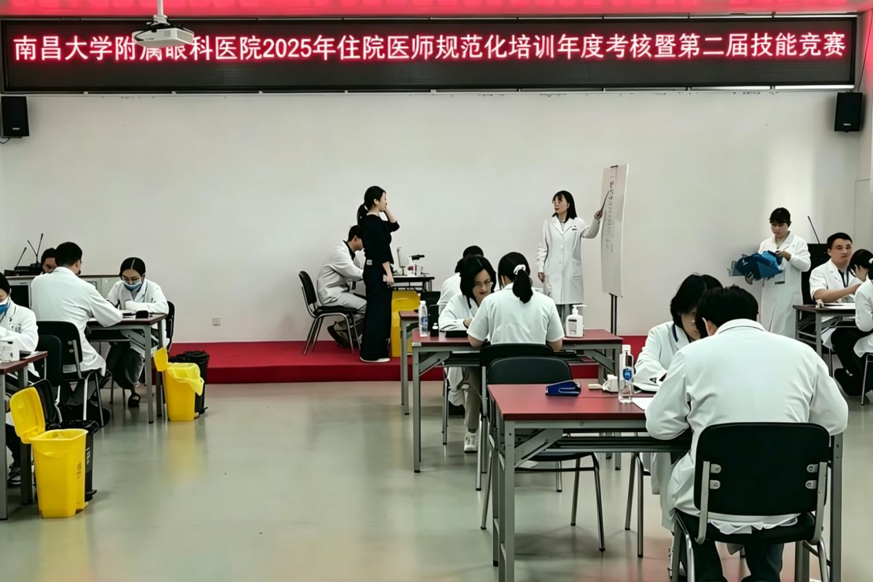 本院讯(严璐报道)为进一步夯实眼科住院医师的专业基础,提升临床操作技能与诊疗服务水平,打造一支技术精湛、作风过硬的眼科医疗队伍,2026年4月26日,南昌大学附属眼科医院举办2025年度住院医师规范化培训(以下简称“住培”)年度考核暨第二届眼科技能竞赛。医院二、三年级全体住培学员(含专硕研究生)共71人同台竞技,以赛促学、以赛促练、以赛促精,在实战中锤炼本领,全力守护群众眼健康。