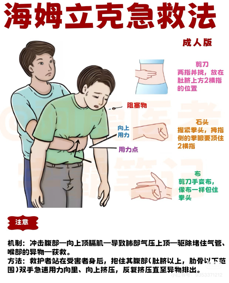 海姆立克急救法是应对气道异物梗阻的有效方法。当有人无法咳嗽、说话或呼吸时,施救者可站于患者身后,双臂环抱其腰部,一手握拳、拳眼置于肚脐上两横指处,另一手包住拳头,快速向上向内施加冲击,直至异物排出。掌握此项技能,关键时刻能够挽救生命。