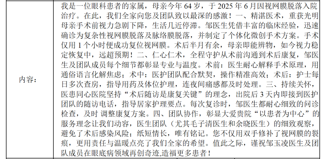 这封通过省卫生健康委转来的感谢信,不仅是对邹玉凌及其团队医术医德的充分肯定,更是对我院整体医疗服务水平的高度认可。未来,我院将一如既往地秉持“以患者为中心”的服务理念,坚持技术与服务并重,专业与温暖同行,用仁心仁术守护每一位患者的视觉健康。