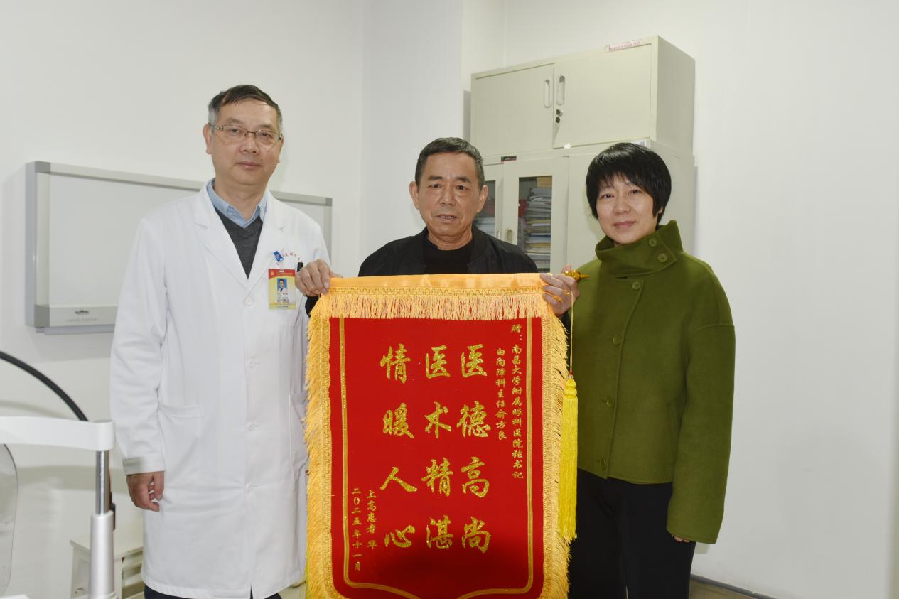 11月18日,在南昌大学附属眼科医院,刚完成复诊的白内障患者华先生(化名)将一面写有“情暖人心 医术精湛 医德高尚”的锦旗送到白内障科主任俞方良手中,并当面表达了诚挚的感谢。那句发自内心的“您走进了我的心里”,不仅温暖了在场的医务人员,也成为这个冬天医患真情最生动的写照。