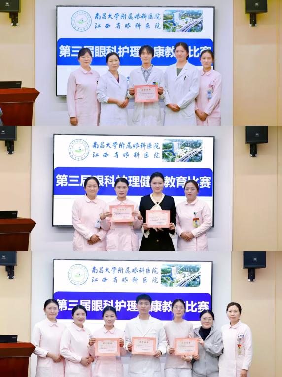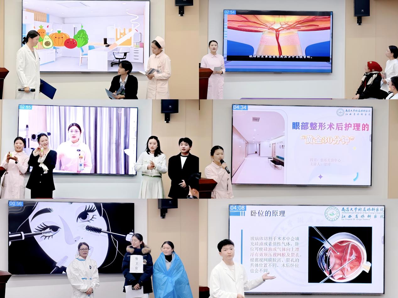 经评审,本届比赛获奖名单正式揭晓:二病区熊博雅、李祖兵、戴欣艺的作品《霸总请打针》斩获一等奖;一病区温金花、舒伟梦、刘桃花的作品《守护“视界”的堤坝——战胜沉默的视力小偷》,与屈光科郭宝秀、张敏、胡时鹏、杨玉莹的作品《“视”不容缓之我要当霸总的小娇妻》荣获二等奖;三等奖则由三病区辛佳、冷京金、徐琳杏子作品《美丽“睛”灵,还是美丽杀手》、整形美容中心梁琦的作品《眼部整形术后护理的“黄金30分钟”》以及手术室万亮的作品《眼科卧位,你会了吗?》共同摘得。
