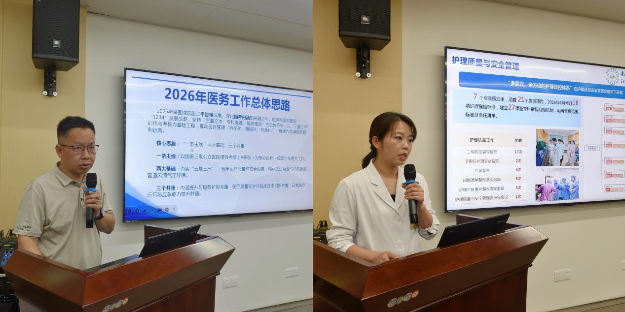会上,医务科围绕“夯基·提能·提质”主题,汇报了2026年医务重点工作思路,2026年,医务科将以“三基三严”专项培训为基础工程,全面实行学习、培训、考核、通报、运用全链条闭环管理,考核结果与职称晋升、岗位聘用、评先评优刚性挂钩,确保培训全员覆盖、人人达标、持证上岗,持续夯实医疗质量安全根基。
