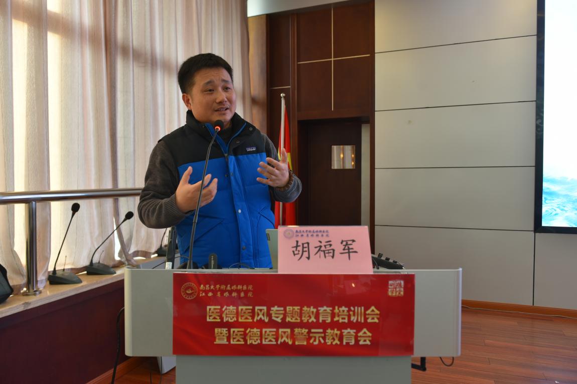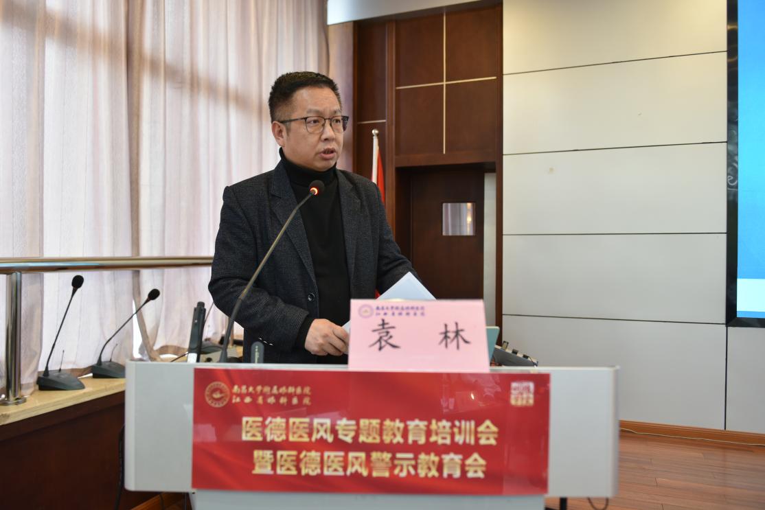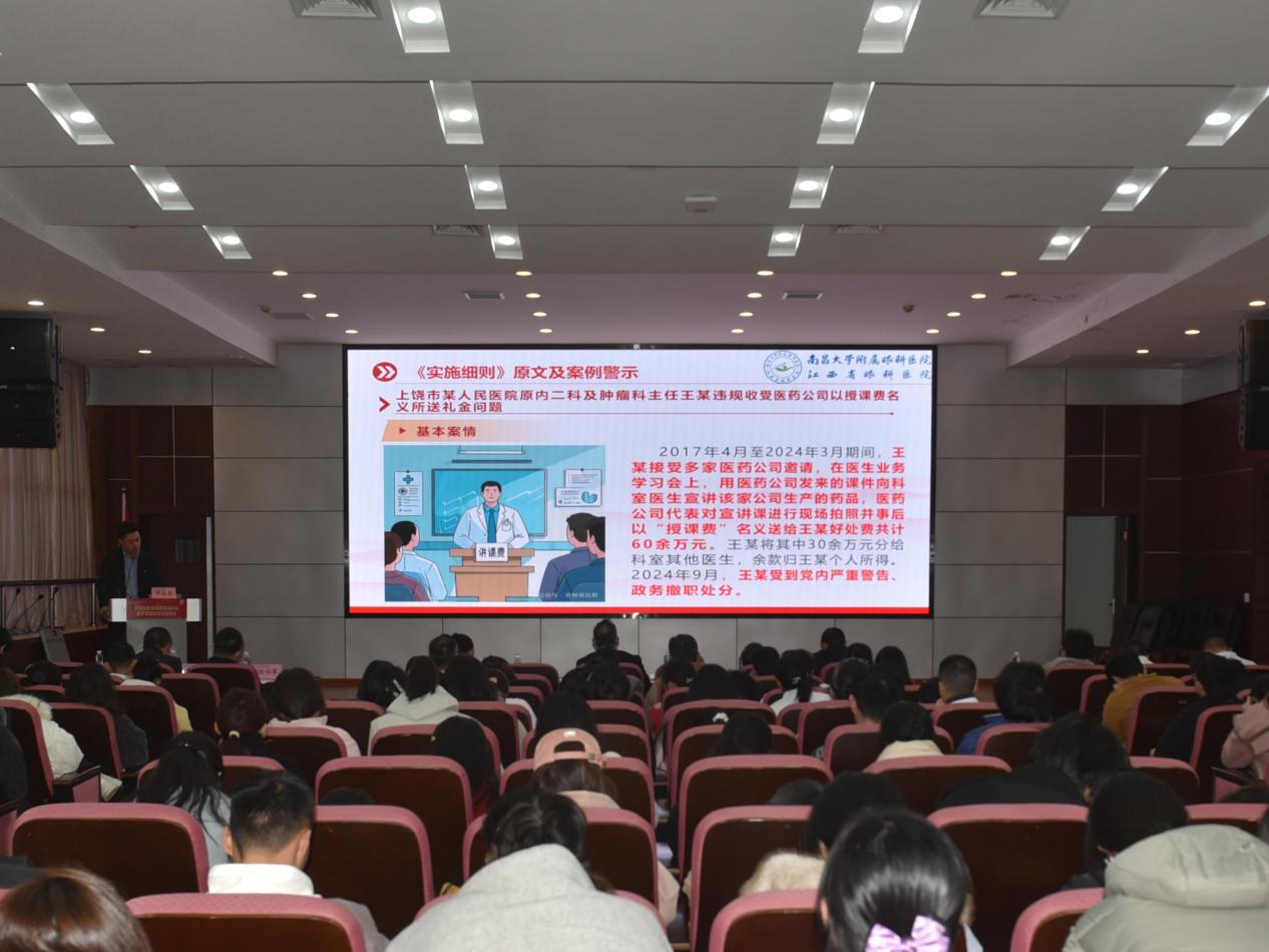 本院讯(蔡佶琛报道)为进一步推进医院医德医风建设工作走深走实,切实筑牢医务人员廉洁从业思想防线,11月18日下午,我院在东湖校区图书馆四楼学术报告厅举办“明德学堂”第八期医德医风专题教育培训会暨警示教育会。在家院领导班子成员、全体中层干部、专兼职纪检干部、医务人员及学生代表参会,党委副书记、院长游志鹏主持会议。